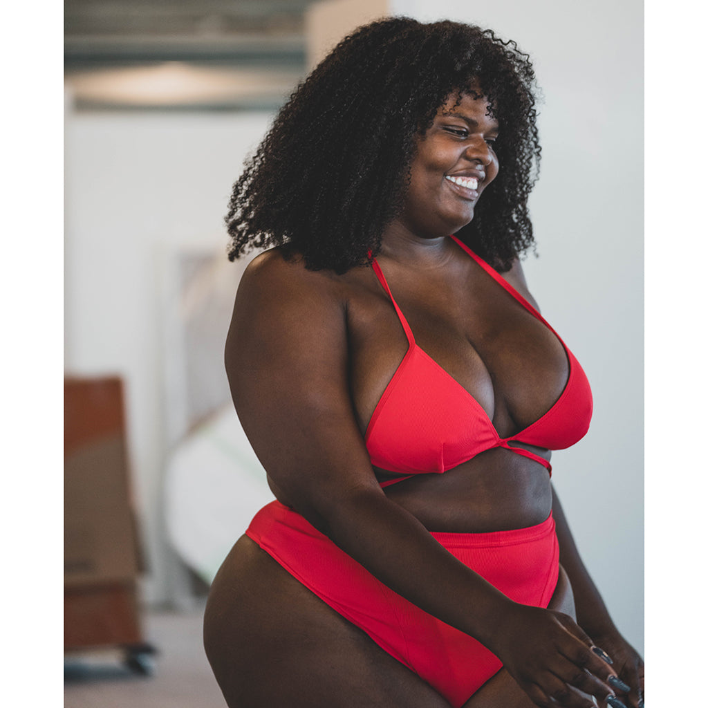 The Chromat Airdrop Tie Top: Red ribbed lycra halter triangle top with fully adjustable string ties.