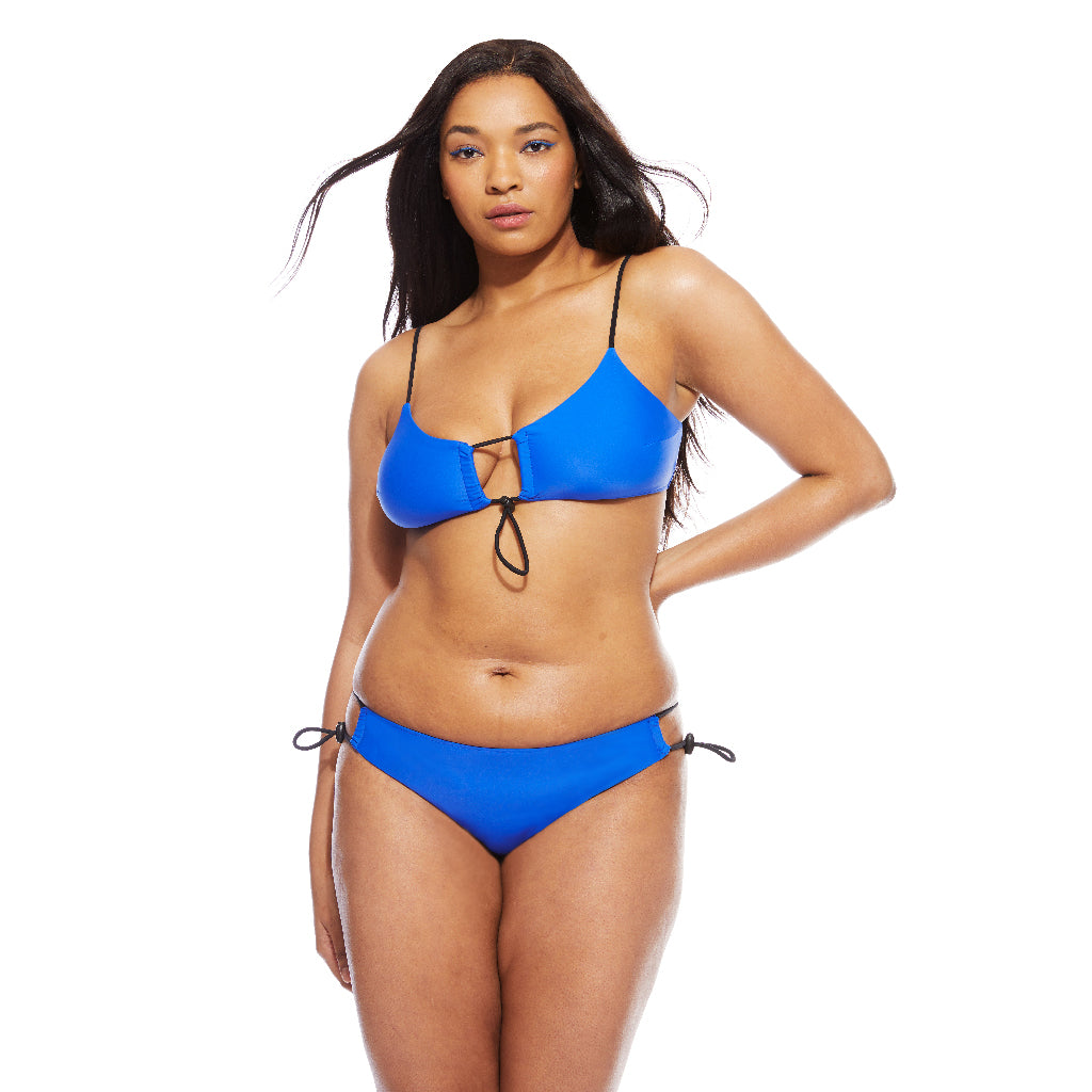 The Chromat Sunset Bottom: Cobalt lycra low-cut swim bottom with black lycra strapping and black cord stop.